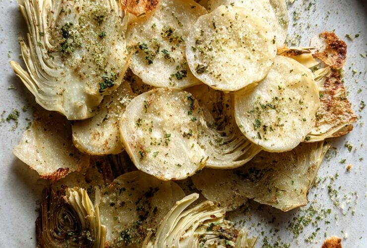 Pečené artyčokové plátky s bylinkovým prachem Hodnocení: 4,8 / 5 Podrobný popis Pečené artyčokové plátky představují jednoduchý, ale mimořádně elegantní pokrm, který vyniká čistou chutí středomořské zeleniny. Na talíři jsou patrné tenké, do křupava zapečené plátky artyčoku, doplněné o jemně ...