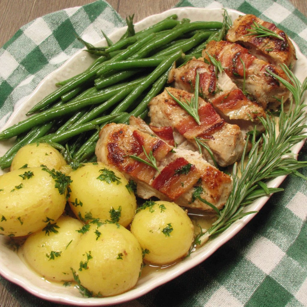 Na talíř naaranžujte kousky kuřecího masa se slaninou, zelené fazolky a brambory s petrželkou. Ozdobte snítkou čerstvého rozmarýnu a ihned podávejte.