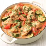 Po upečení nechte pokrm 5–10 minut odpočinout, aby se chutě spojily. Posypte čerstvou nasekanou petrželkou a podávejte teplé.