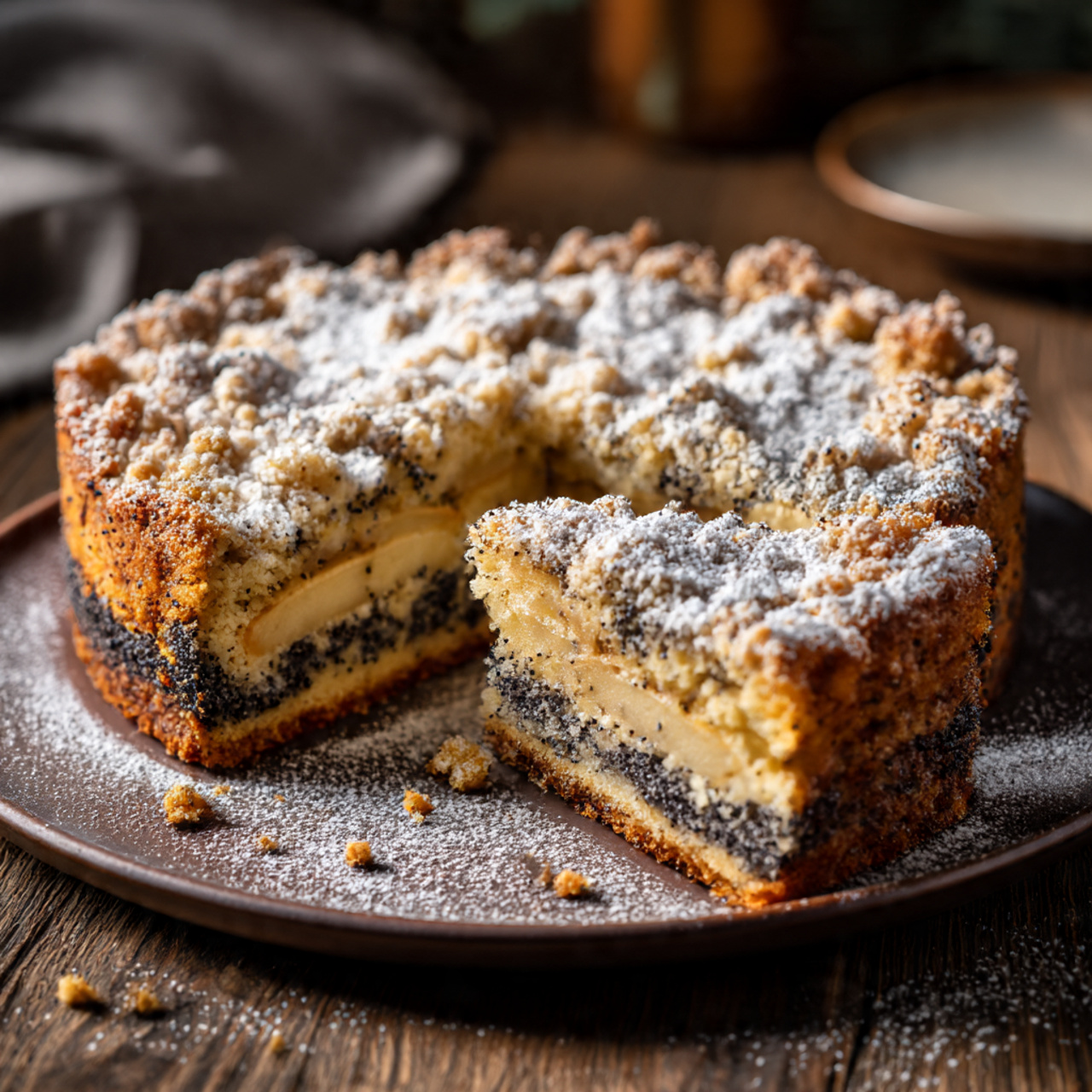 Na fotografii je zachycen vysoký, nadýchaný a bohatě vrstvený koláč, jehož jednotlivé vrstvy se po nakrojení jasně odlišují. Spodní základ drží pevný tvar, maková část působí šťavnatě a jablka přinášejí přirozenou sladkost a vláčnost. Svrchní drobenka je pečená do křupava, s jemně nazlátlými tóny a decentním zasněžením moučkovým cukrem, což koláči dodává domácí charakter i vizuální přitažlivost.