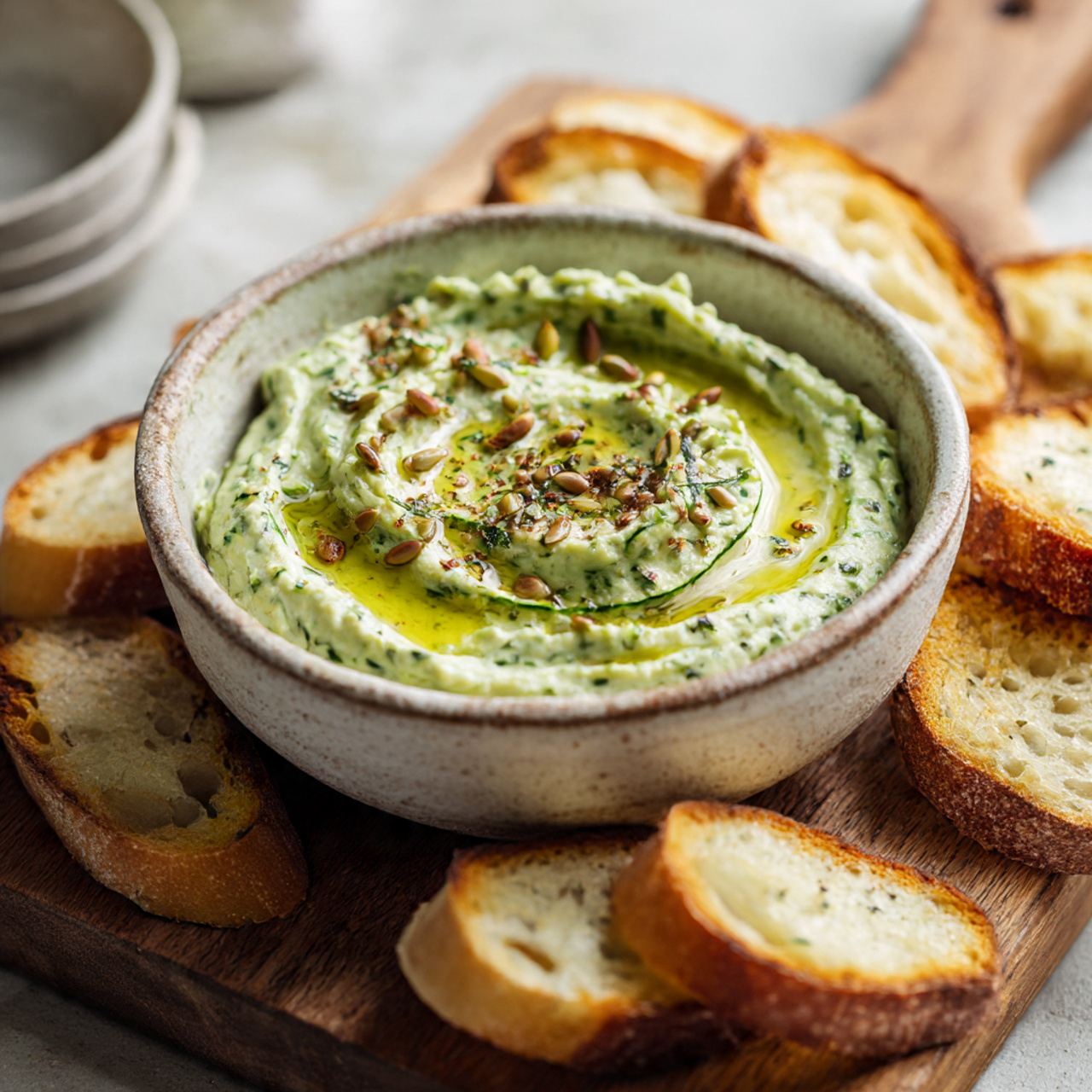 Fotografie zachycuje bohatě našlehanou, jemně nazelenalou pomazánku servírovanou ve stylové keramické misce a dozdobenou olivovým olejem a semínky pro extra texturu. Podává se s křupavými plátky světlého pečiva, které zvýrazňují krémovou konzistenci pomazánky. Tento pokrm je ideální na letní posezení, rodinné oslavy, jako originální předkrm nebo výživná svačina k vínu.