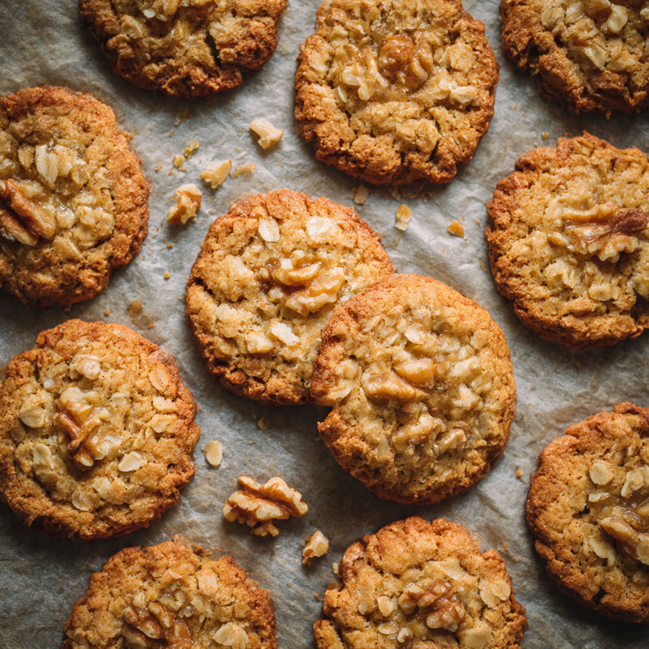Babiččiny ovesné sušenky s medem a ořechy patří mezi ty recepty, které nikdy neztratí své kouzlo. Vynikají jednoduchostí, přirozenou sladkostí medu, rustikální strukturou ovesných vloček a jemným křupnutím vlašských ořechů. Na fotografii lze vidět sušenky se zlatavou barvou, lehce popraskaným povrchem a měkkými kousky karamelizovaného ořechu uprostřed. Vypadají rustikálně a domácí, přesně tak, jak byly kdysi připravované v rodinných kuchyních.