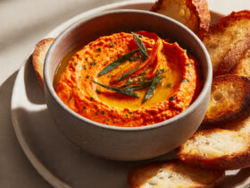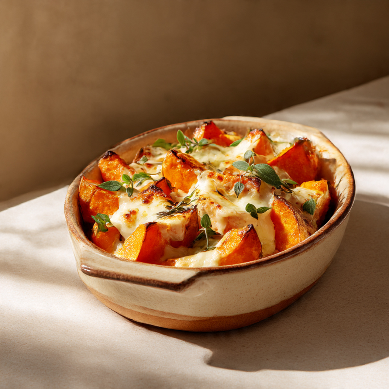 Zapečená dýně s medem a sýrem představuje dokonale vyvážený podzimní pokrm spojující přirozenou sladkost dýně, jemnou krémovou strukturu rozpečeného sýra a chuťový kontrast medové glazury. Na fotografii je patrný zlatavý povrch, výrazné karamelizační okraje a doplňující čerstvé bylinky, které podtrhují aroma celého pokrmu.