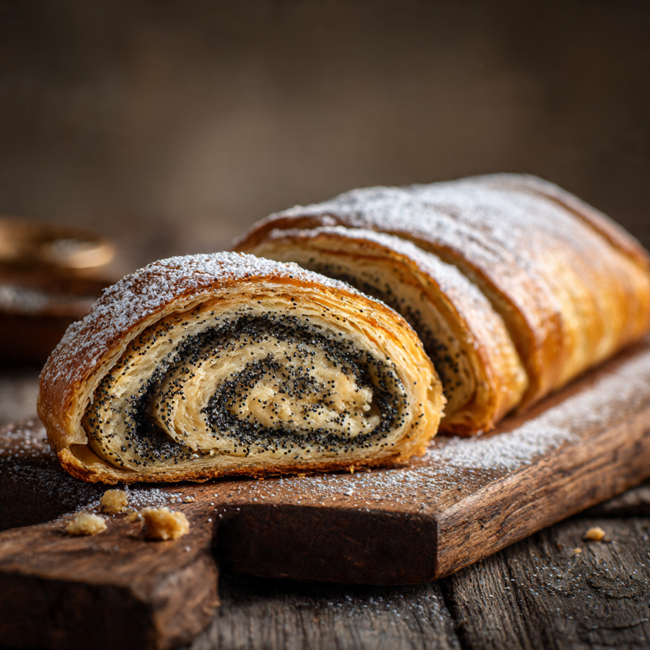 Makový závin je symbolem české domácí kuchyně – voňavý, sytý a plný nostalgie. Tato babiččina verze s domácí makovou náplní spojuje tradiční pečení s precizností, kterou měly naše babičky v malíčku. Na fotografii je vidět dokonale zlatavý, křehký závin s bohatou, lesklou makovou spirálou, zasypaný lehkým popraškem moučkového cukru. Každý plátek působí rustikálně a zároveň elegantně – ideální dezert ke kávě nebo jako sváteční pochoutka.