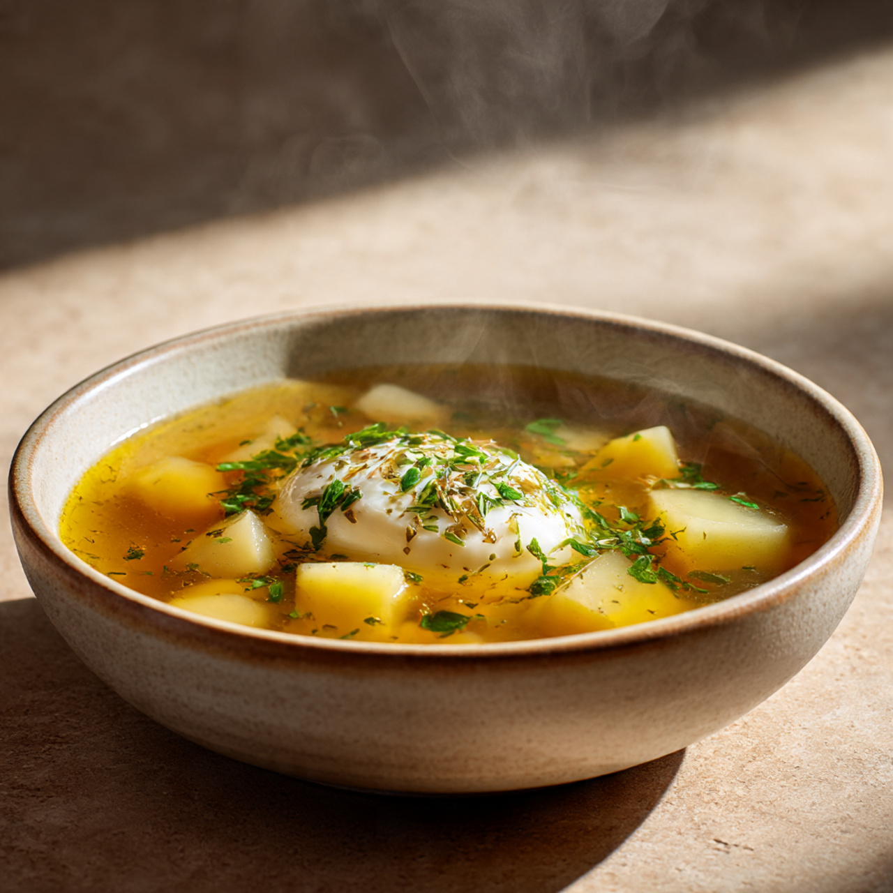 Podávejte ihned po přípravě, ideálně v nahřáté keramické misce, jak je vidět na fotografii. Jemný zlatavý vývar s vůní česneku, brambory a ztracené vejce uprostřed vytváří dokonalou harmonii barev i chutí. Kombinace horké polévky a čerstvých bylinek dodává pokrmu domácký, autentický charakter.