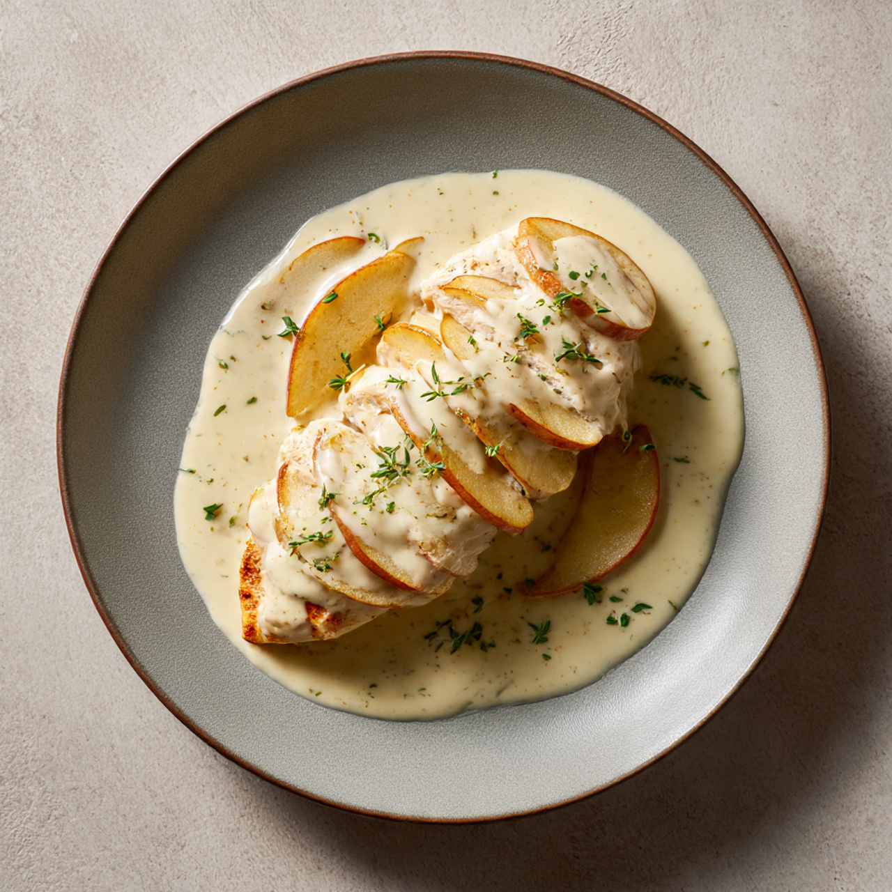 Na fotografii je dokonale naaranžovaný pokrm: šťavnaté kuřecí prso krájené na tenké plátky, proložené jemně opečenými jablky a přelité hladkou smetanovou omáčkou. Posypání čerstvým tymiánem dodává jídlu elegantní vzhled i vůni. Doporučuje se servírovat na nahřátém talíři, aby omáčka zůstala krémová a teplá až do posledního sousta.