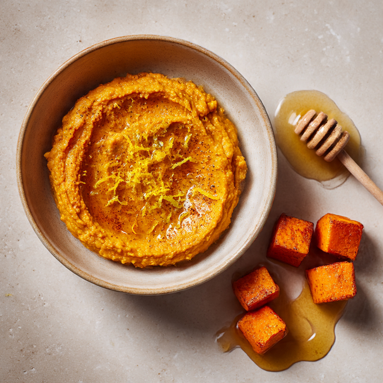 Pečená dýňová pomazánka s medem a citronem je moderní variací na tradiční podzimní chutě. Na fotografii vidíme dokonale krémovou strukturu, výraznou oranžovou barvu a svěží citronovou kůru, která kontrastuje s jemnou sladkostí medu. Je to pomazánka vhodná k pečivu, toustům i křupavé bagetě a skvěle se hodí na slavnostní stůl, ale i jako rychlá a výživná svačina.