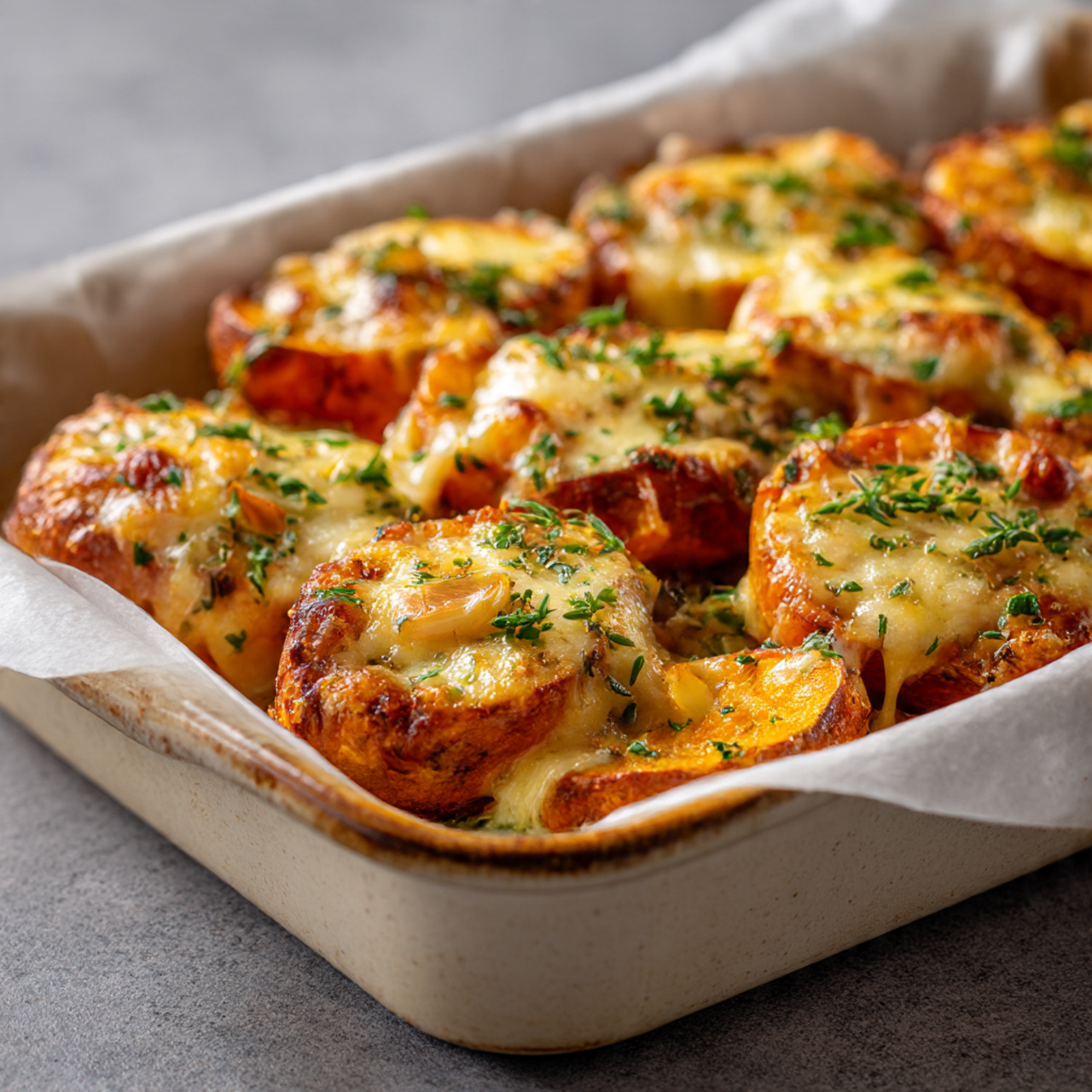Zapečené batáty s česnekem a sýrem – lahodná voňavá příloha i samostatné jídlo