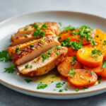 Zapečené batáty s česnekem a sýrem patří mezi moderní, ale přesto maximálně domácí a útulné pokrmy, které si získají každého milovníka zeleniny. Sladkost pečených batátů se dokonale propojuje s vůní česneku, kterou doplňuje hutná vrstva rozpuštěného sýra. Na fotografii jasně vidíme krásně opečené okraje batátů, zlatavě roztavený sýr s jemnými tmavšími místy, které vznikly při gratinování, a bohatou vrstvu čerstvých bylinek, které pokrmu dodávají svěžest.