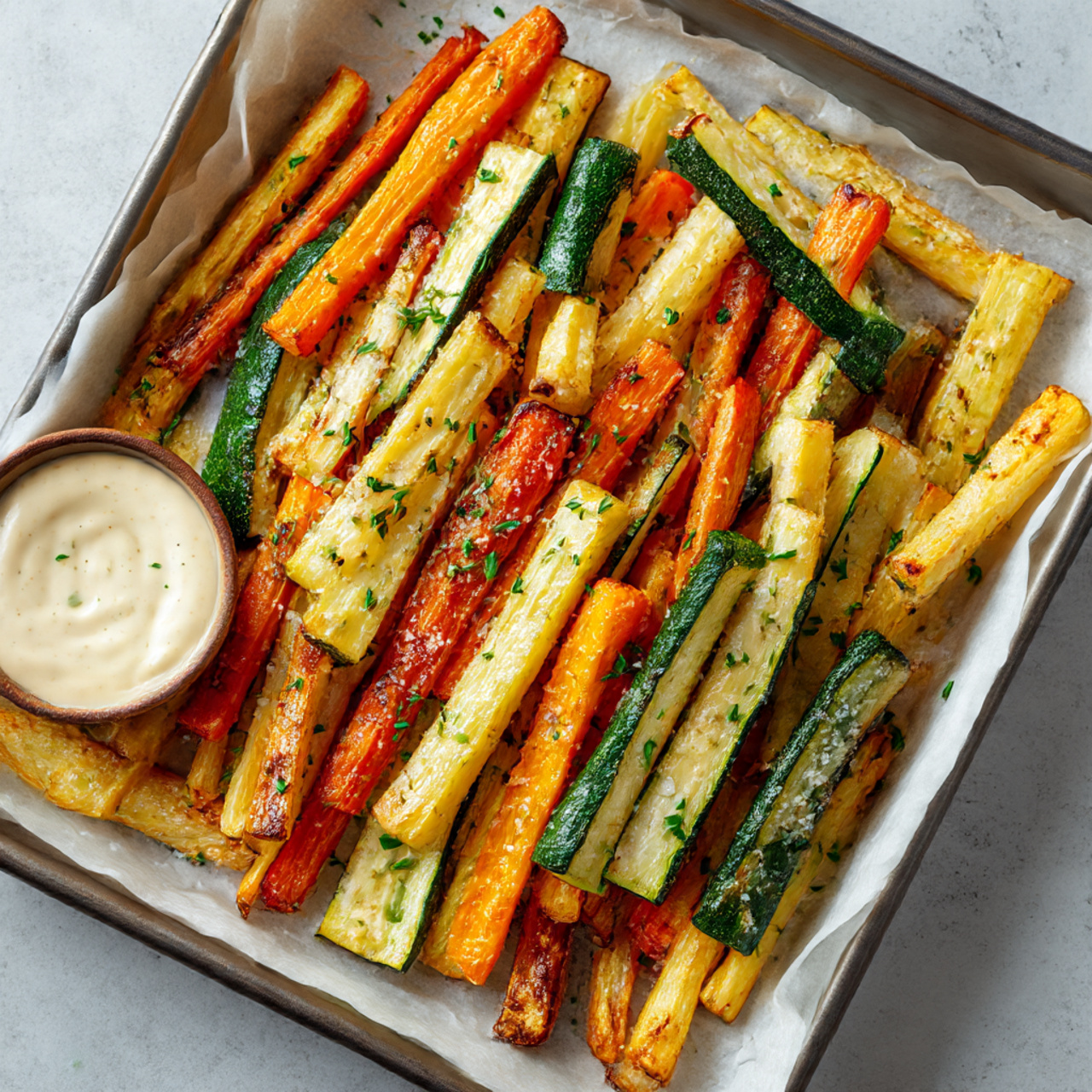 Křupavé pečené zeleninové hranolky patří k oblíbeným pokrmům, které kombinují jednoduchost, zdravý styl a lahodnou chuť. Na fotografii vidíme pečlivě nakrájené hranolky z mrkve, pastináku a cukety, rovnoměrně opečené dozlatova, posypané čerstvými bylinkami a podávané s jemným dipem. Tento recept je ideální nejen jako lehká příloha, ale také jako zdravý snack pro celou rodinu. Pečením v troubě se zvýrazní přirozená sladkost kořenové zeleniny a cuketa dodá jemnost a vláčnost. Výsledkem je barevná, atraktivní a chuťově bohatá kombinace.