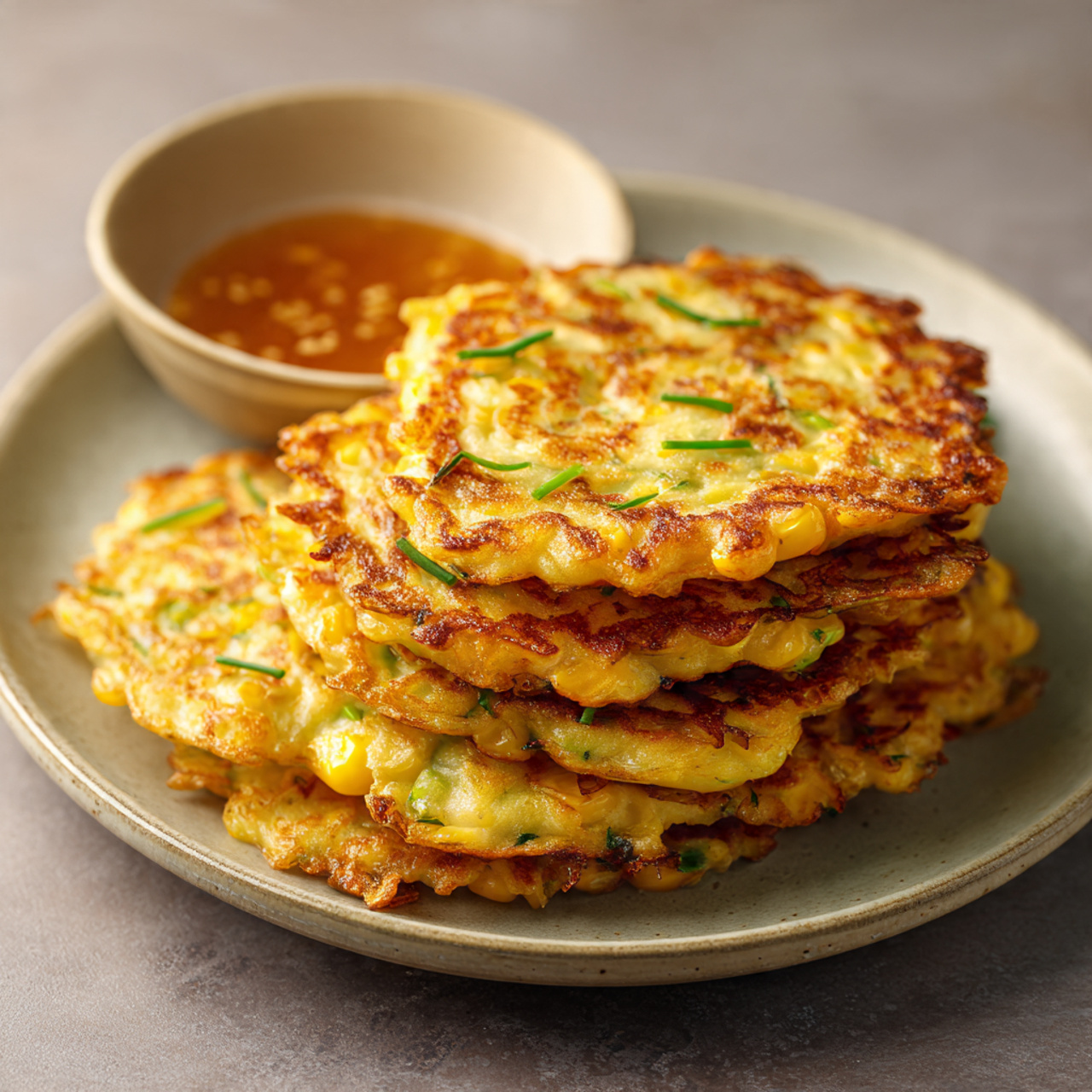 Kukuřičné placičky s pažitkou představují jednoduché, rychlé a přesto velmi atraktivní jídlo, které potěší svou křupavou strukturou i jemně nasládlou chutí kukuřice. Na fotografii je vidět jejich zlatavý povrch, pravidelný tvar a sytý odstín, který vzniká jak díky kukuřici, tak díky dobře zpracovanému těstu. Podávané s pikantní omáčkou tvoří ideální kombinaci slaného, jemně sladkého a lehce ostrého tónu. Pokrm je vhodný jako teplá večeře, originální příloha nebo i jako party pohoštění.
