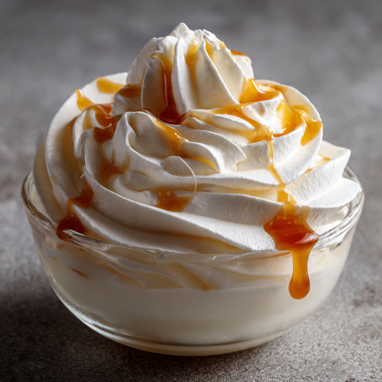 Tento dezert je ukázkou jednoduchosti, která působí luxusně. Jemná šlehačková pěna s medem a karamelem je lehká, nadýchaná, dokonale hebká a v chuti jemně sladká s výrazným medovým akcentem. Sametová struktura je jasně viditelná i na fotografii – pěna je hladká, stabilní a drží tvar v elegantních spirálách, bez povolení či zhroucení. Pramínky karamelu přidávají kontrast barev i chutí, dezert působí profesionálně, přesto jeho příprava nezabere více než několik minut.