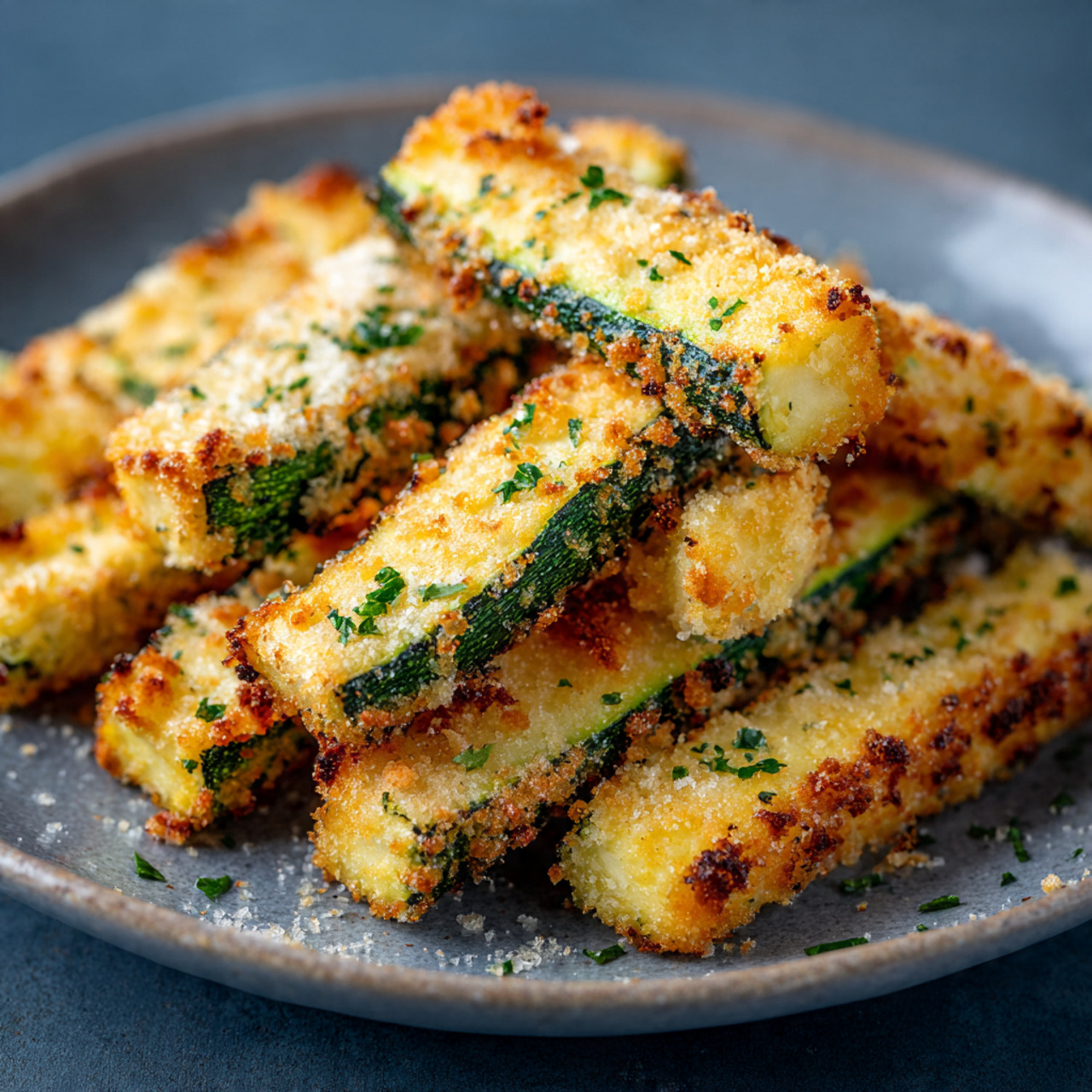 Pečené cuketové hranolky s parmazánovou krustou jsou skvělou ukázkou toho, že i běžná zelenina může chutnat šťavnatě, moderně a překvapivě návykově. Jemná cuketa uvnitř zůstává šťavnatá, zatímco povrch se díky parmazánu a strouhance mění v křupavou zlatavou slupku. Na fotografii je jasně vidět kontrast mezi měkkým vnitřkem a křupavým obalem – jednotlivé hranolky mají rovnoměrně vypékaný povrch s výraznými body opékání, které dodávají plnou chuť i vizuální atraktivitu.