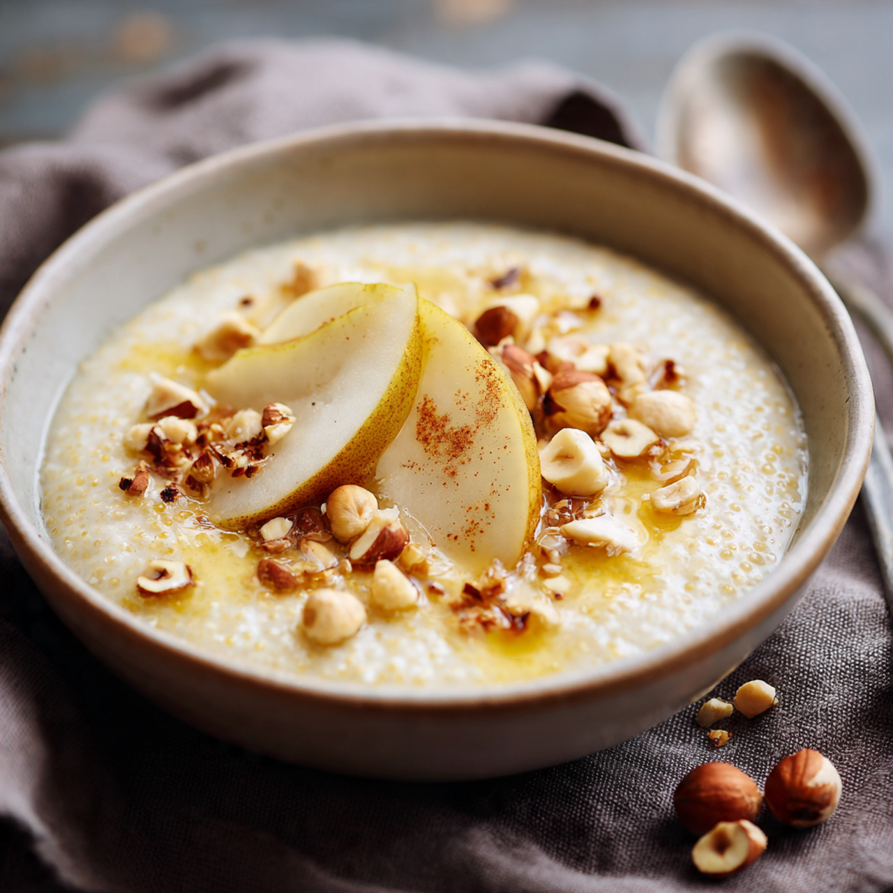 Jáhlová kaše je jedním z nejjemnějších a nejzdravějších teplých snídaní, které lze připravit během krátké chvíle a zároveň si dopřát pocit sytosti a klidu. Kombinace vařených jáhel s mlékem vytváří krémový základ, který krásně doplňuje máslo, lískové oříšky a přirozeně sladká hruška. Právě kontrast chutí a textur je na této kaši výjimečný – měkký základ, křupavé oříšky a šťavnaté ovoce na povrchu.