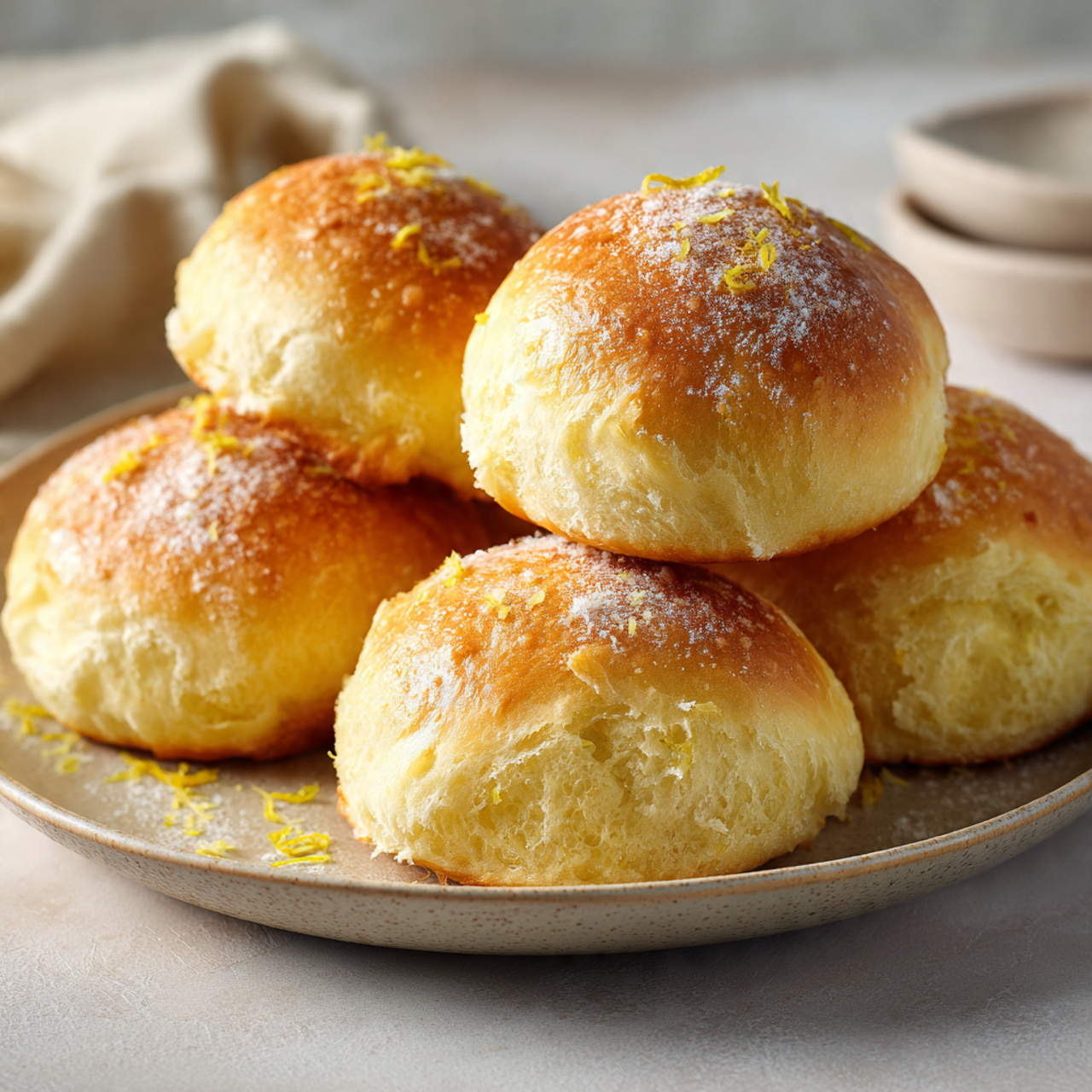 Jogurtové mini bochánky s citronovou kůrou jsou jemné, nadýchané a lehce nasládlé pečivo, které spojuje vláčnost jogurtového těsta s osvěžující vůní citronu. Na fotografii jsou vidět perfektně vykynuté bochánky se zlatavou lesklou kůrkou, jemným posypem cukru a lehkými proužky citronové kůry, které jim dodávají svěžest a krásný vizuální efekt.