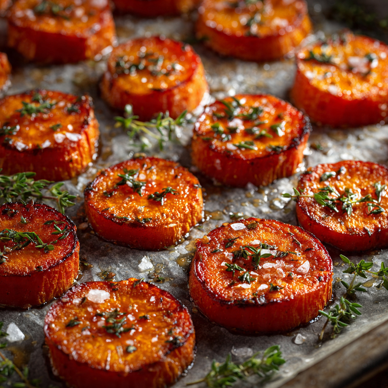 Pečené mrkvové medailonky s tymiánem jsou jednoduchým, ale maximálně efektním zeleninovým pokrmem, který spojuje přírodní sladkost mrkve, bylinkové aroma a lehkou karamelizaci vznikající při pečení. Na fotografii je vidět přesně to, čeho chceme docílit: rovnoměrně nakrájené plátky mrkve opečené do zlatavě oranžové barvy, s jemně křupavými okraji, posypané čerstvým tymiánem a mořskou solí.