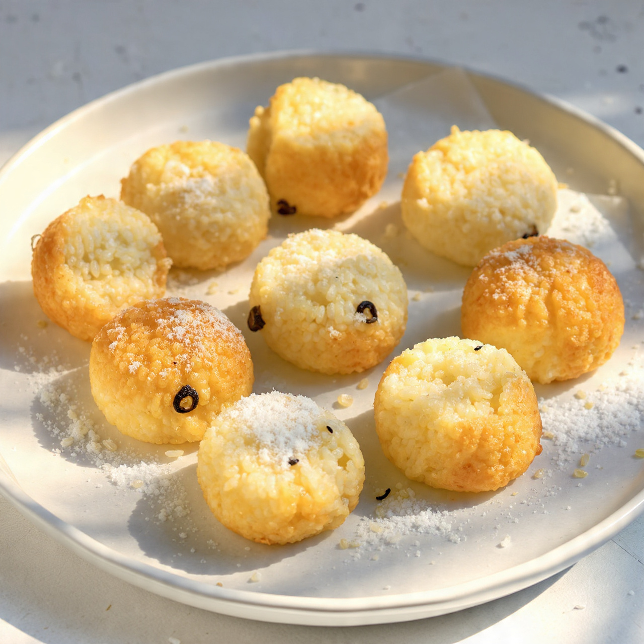 Pečené rýžové šišky s jemným vanilkovým aroma představují jednoduchý, ale zároveň neobyčejně lahodný dezert, který vychází z tradičních sladkých jídel připravovaných z uvařené rýže. Na fotografii jsou vidět dokonale vytvarované malé rýžové kuličky se zlatavou krustou, které byly pečeny na plechu a poté jemně poprášeny cukrem. Jejich povrch je lehce křupavý, zatímco vnitřek zůstává vláčný, měkký a krásně voňavý.