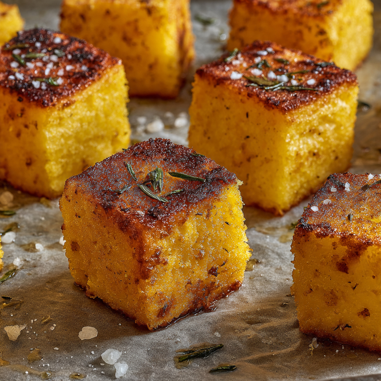 Kukuřičné polentové kostičky pečené do křupava jsou jednoduchým, ale mimořádně efektním receptem. Spojují výbornou chuť polenty, jemnost uvnitř a křupavý povrch, který vzniká díky vysoké teplotě při pečení. Na fotografii je krásně zachycena typická struktura a zlatavý povrch, který činí tento pokrm vizuálně atraktivním a chuťově neodolatelným.