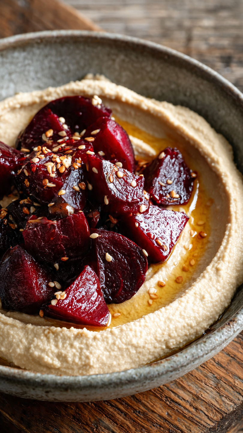 Cizrnový hummus s pečenou červenou řepou je elegantní a chuťově vyvážený pokrm, který spojuje tradiční recept s moderním pojetím. Fotografie dokonale vystihuje kontrast mezi světlým, krémovým hummusem a sytě červenou řepou, doplněnou olejem a sezamem. Tento recept je ideální volbou pro jistý, profesionální obsah na web zaměřený na zdravou kuchyni, vegetariánské recepty nebo moderní gastronomii.