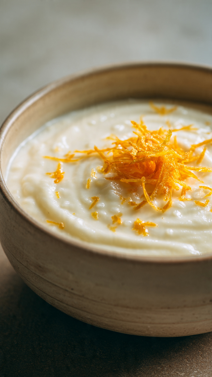 Krémový rýžový dezert s pomerančovou kůrou je jemný, sametově hladký dezert, který vyniká svou jednoduchostí a čistou chutí. Na fotografii je patrná hustá, krémová konzistence rýže pomalu vařené v mléce, doplněná svěžím aromatem jemně nastrouhané pomerančové kůry. Dezert působí elegantně, lehce rustikálně a přitom velmi uklidňujícím dojmem.