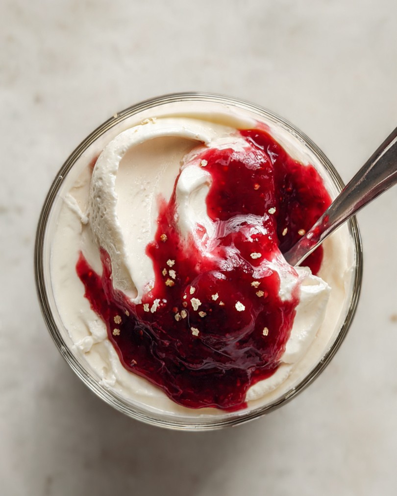 Tento dezert zaujme na první pohled kontrastem sněhově bílého, sametově hladkého kokosového krému a sytě červeného malinového přelivu. Krém má hutnou, ale zároveň nadýchanou konzistenci, připomínající jemný tvarohový krém nebo lehký cheesecake bez korpusu. Malinová vrstva je lesklá, lehce tekutá, s patrnými drobnými semínky a výraznou ovocnou kyselinkou, která vyvažuje přirozenou sladkost kokosového základu. Dezert je servírován ve skleničce, což umožňuje krásně vyniknout vrstvení a texturám.