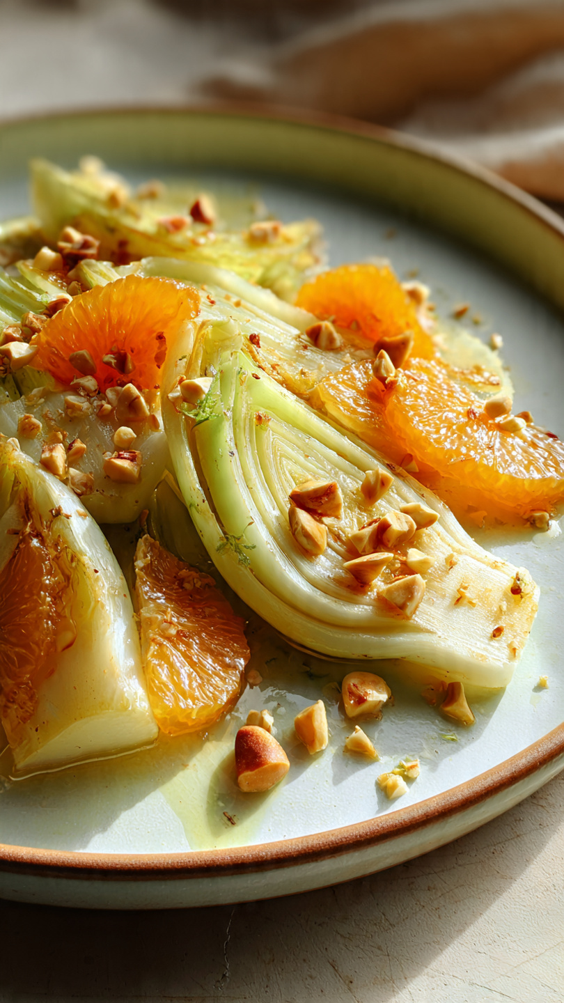Dušený fenykl s pomerančem a lískovými oříšky je jemná, přitom chuťově výrazná zeleninová specialita inspirovaná středomořskou kuchyní. Na fotografii je vidět fenykl rozdělený na klínky, které jsou zlehka opečené dozlatova a následně podušené do měkka. Doplněny jsou šťavnatými segmenty pomeranče, které přinášejí osvěžující sladkokyselý kontrast, a posypány nasekanými lískovými oříšky, jež dodávají pokrmu příjemnou křupavost. Pokrm je přelitý lehkou citrusovou šťávou a olivovým olejem, díky čemuž působí velmi lehce a elegantně.