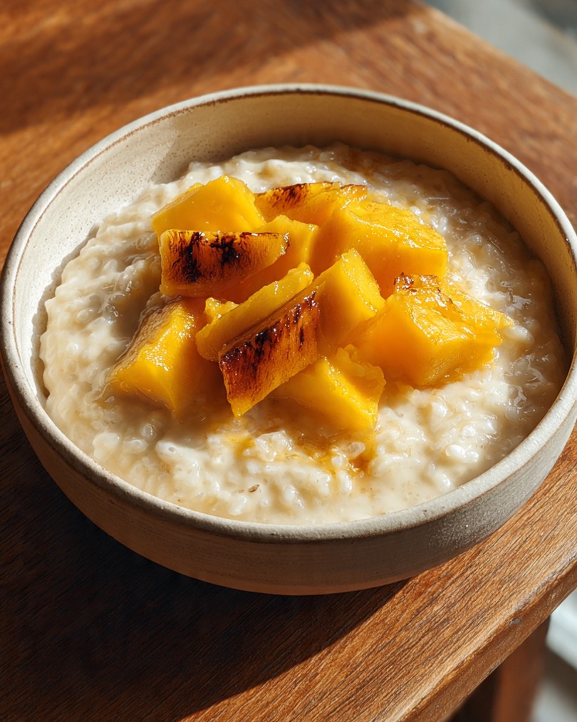 Krémová rýžová miska s pečeným mangem je jednoduchý, ale velmi elegantní pokrm, který vyniká čistými chutěmi a krásnou prezentací. Spojení jemné rýže a teplého, lehce karamelizovaného ovoce vytváří vyvážený a uklidňující zážitek. Tento recept je ideální pro čtenáře, kteří hledají zdravější, přitom však chuťově bohaté a vizuálně přitažlivé jídlo vhodné pro každodenní vaření i víkendové zpomalení.