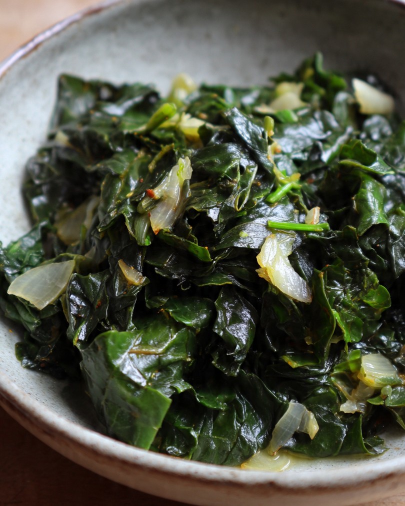 Dušený mangold s česnekem a citronem je jednoduchý, lehký a velmi elegantní zeleninový pokrm, který dokonale vynikne díky své přirozené chuti. Na fotografii je patrná tmavě zelená barva listů, jemně lesklý povrch a lehce zavadlá struktura, typická pro správně krátce dušený mangold. Listy zůstávají měkké, ale nikoli rozvařené, a jednotlivé kousky cibule a česneku dodávají pokrmu hloubku a vůni.