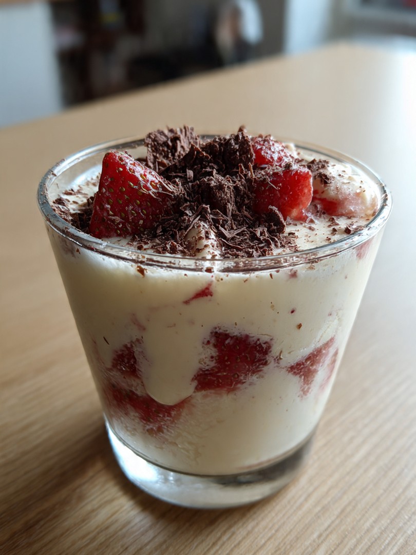 Na fotografii je patrné vrstvení jednotlivých složek ve skle – krém, kousky jahod a čokoláda na povrchu vytvářejí nejen chuťově vyvážený, ale i vizuálně atraktivní dezert. Tento pohár je ideální jako rychký dezert po obědě, lehká sladká večeře nebo efektní pohoštění pro návštěvu.