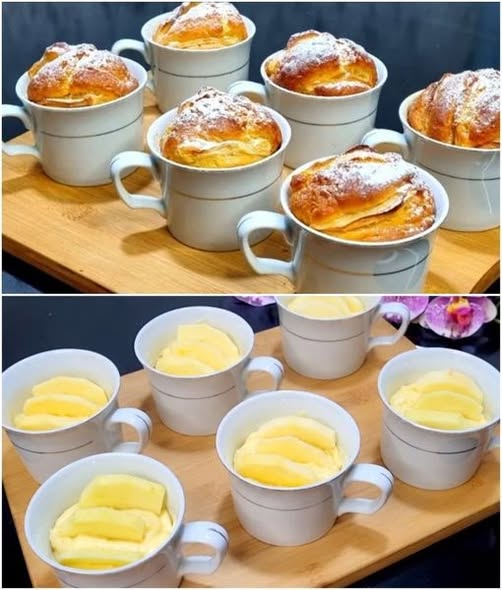 5️⃣ Do hrníčků dej plátky jablek, zalij těstem (do ¾).