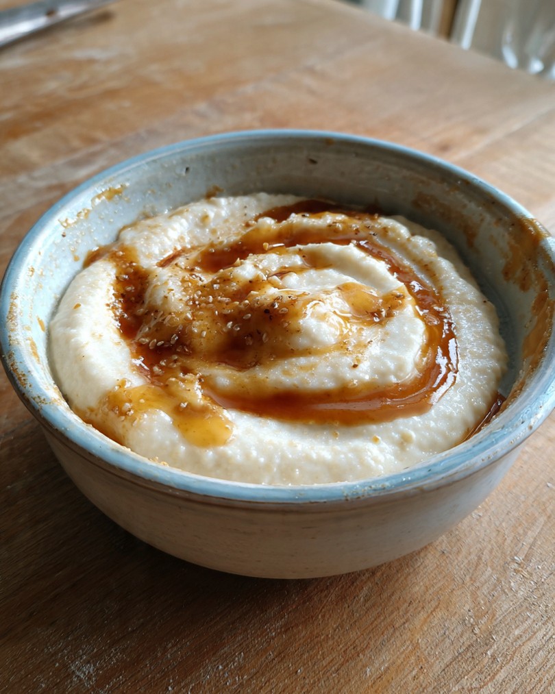 Na první pohled zaujme hladký, krémový povrch kaše stočený do jemné spirály, doplněný lesklým karamelovým přelivem v teplých hnědých odstínech. Konzistence je sametová, bez hrudek, chuť plná a uklidňující. Právě tato kombinace jednoduchosti a drobného chuťového „švihu“ dělá z receptu ideální dezert i vydatnou sladkou snídani.