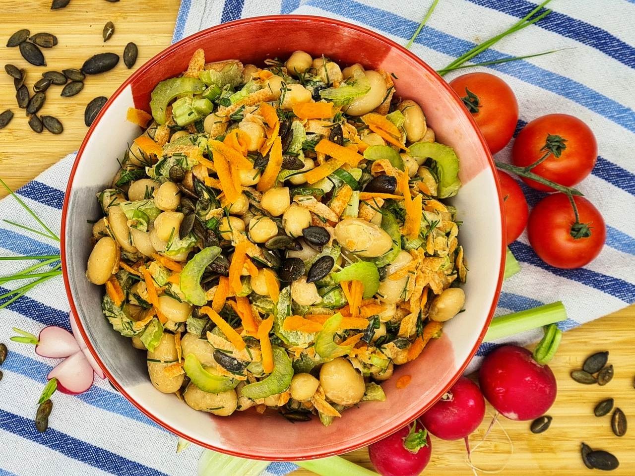 Na první pohled zaujme bohatá směs barev a struktur. Krémově světlá cizrna je doplněna jemně nastrouhanou mrkví, křupavými plátky řapíkatého celeru a zelenými bylinkami. Povrch salátu doplňují tmavší semínka, která dodávají lehce oříškový charakter a výraznou křupavost. Výsledkem je harmonický pokrm, který kombinuje jemnost luštěnin s čerstvostí zeleniny a aromatem bylinek.